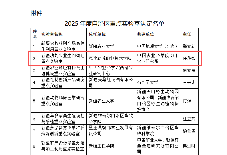 近日,2025年度新疆维吾尔自治区重点实验室认定名单公布,由中国农业科学院都市农业研究所联合克孜勒苏职业技术学院申报共建的“新疆功能农业生物智造重点实验室”成功获批,都市所功能植物培育与应用创新团队首席科学家任茂智研究员担任实验室主任。这是都市所深耕功能农业与生物制造领域、服务国家区域发展战略的重要突破,为跨区域协同创新、推动南疆富硒健康产业升级搭建了核心科研平台。