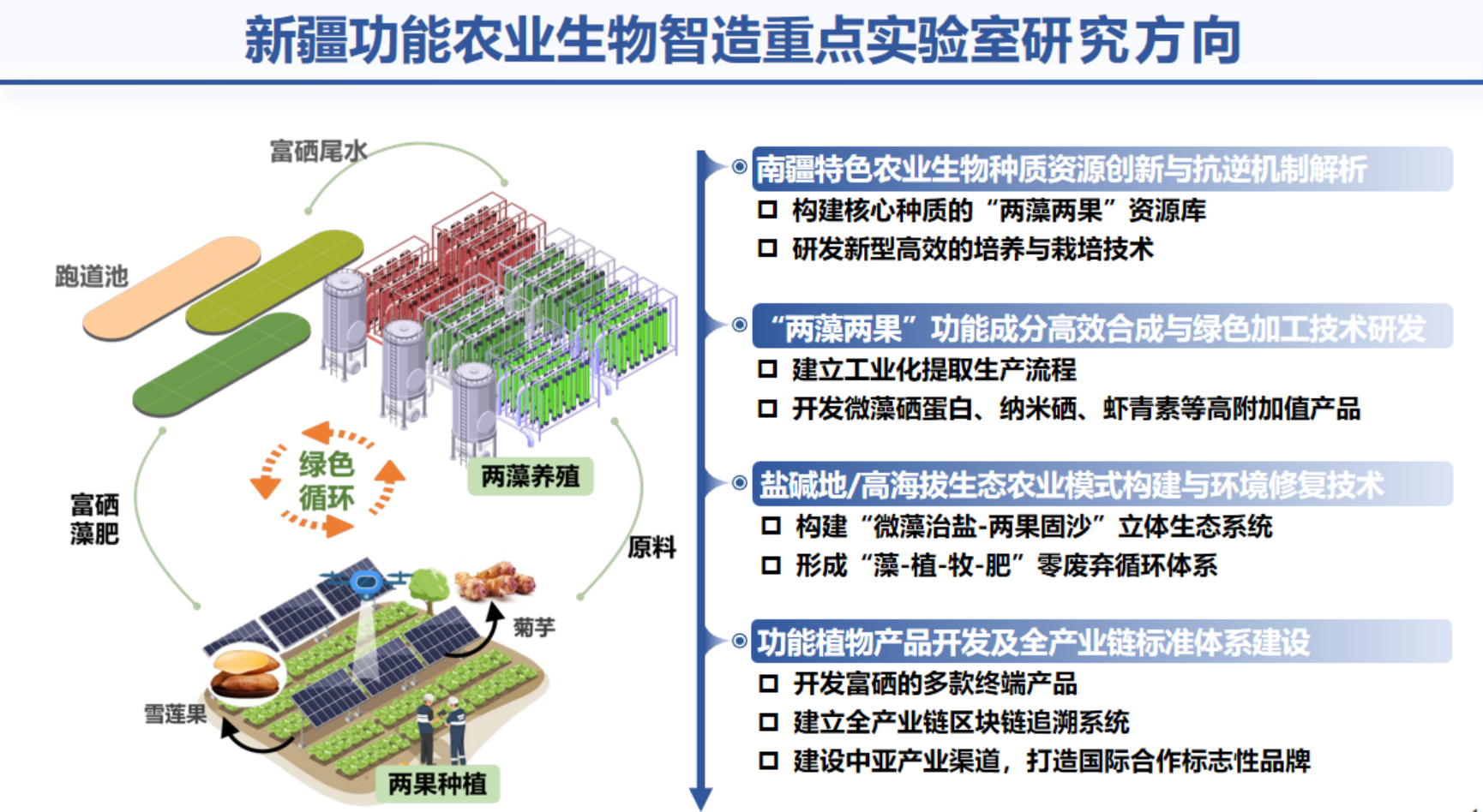 作为国家级都市农业科研领军机构,都市所长期聚焦生物制造、功能农业等战略领域,此次联合共建实验室,是落实党的二十届四中全会“十五五”规划建议中生物制造产业发展部署的具体实践。实验室立足南疆“硒腰带”独特资源禀赋,紧扣自治区“十大产业集群”发展需求,创新构建“微生物(蛋白核小球藻/雨生红球藻)-植物(胰岛果/无花果)-动物(黄粉虫/药蝎)”三物循环链式富硒生物制造理论体系,围绕硒蛋白、硒多糖、硒脂质三大核心产物,打造“土壤健康-动物健康-人体健康”全链条技术闭环,可有效填补我国富硒功能食品领域关键技术空白。