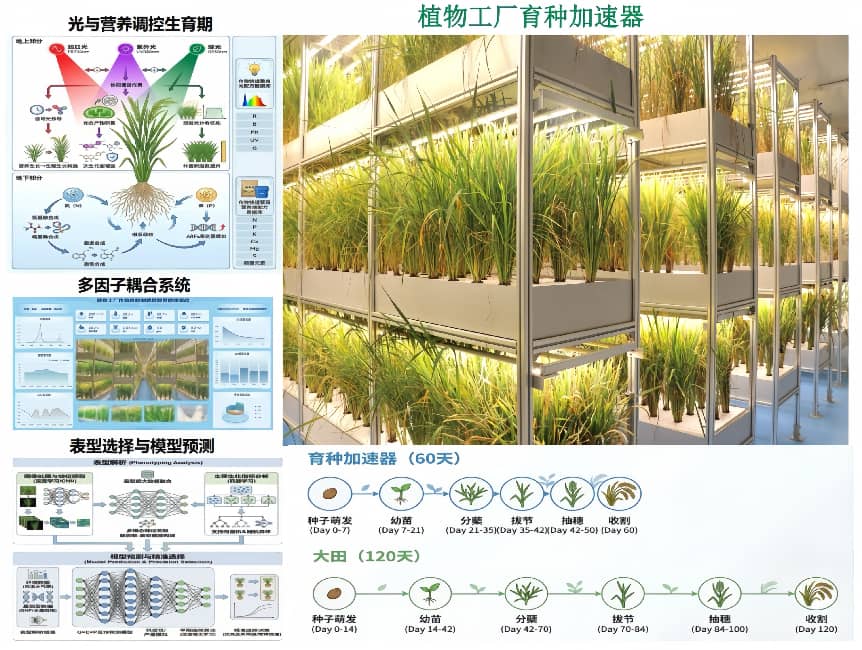 围绕提升育种效率、加速种业创新的国家战略需求,项目团队历经10余年的系统攻关,揭示了植物工厂环境下信号光谱调控作物快速生长与成花转化的作用规律,阐明了营养液栽培条件下C、N、P等营养元素与根际微环境促进作物营养生长向生殖生长快速转换的作用机理,构建了加速器环境下作物表型原位活体精准获取方法与性状动态预测模型,突破了作物“快速繁育”与“精准选择”融合的关键技术难题,首创植物工厂育种加速器工程技术体系,实现了水稻、小麦、大豆等10余种作物、2万余份育种材料生育周期缩短51%-63%,一年加代5-6次。